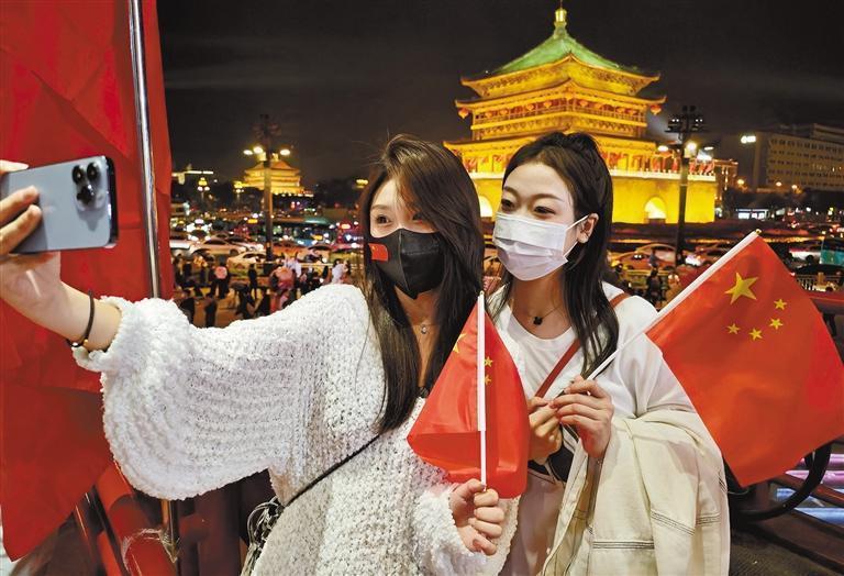 國慶前夜,兩個年輕人在西安鐘樓前自拍留念。 記者 楊小兵攝