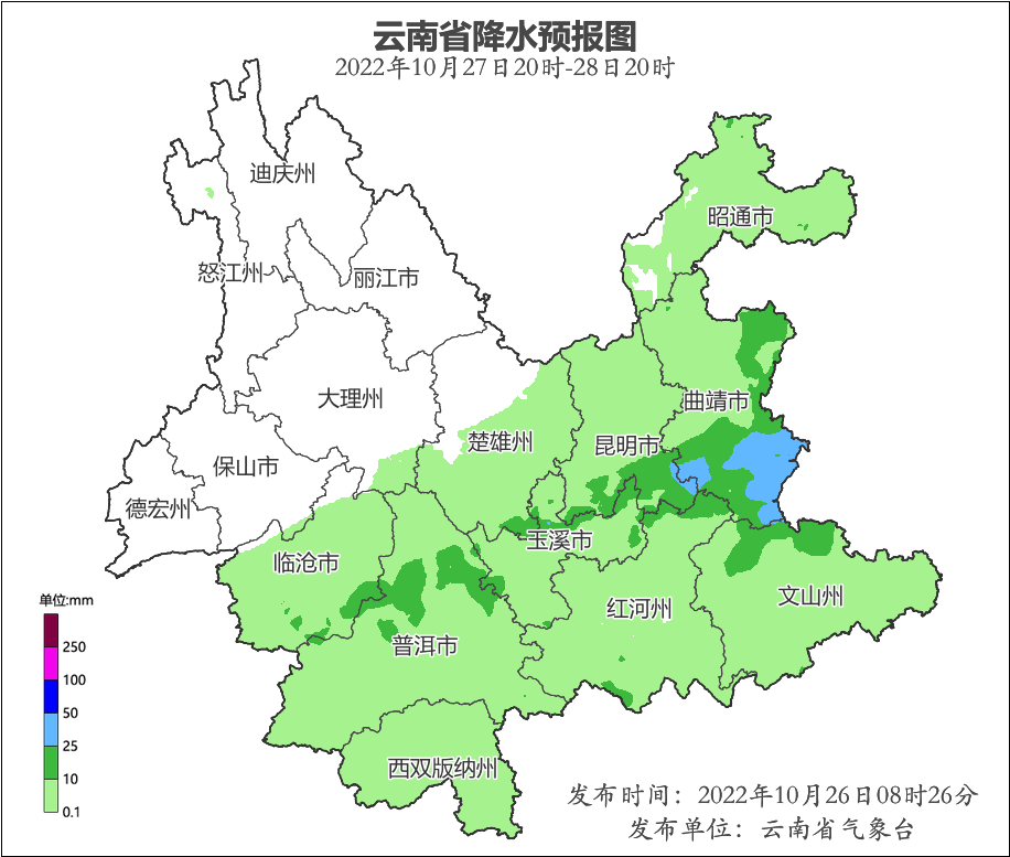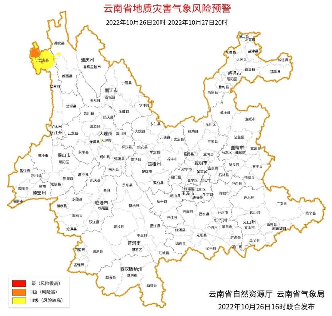 受降雨影響,2022年10月26日20:00~10月27日20:00,怒江州西北部局部區(qū)域發(fā)生滑坡泥石流的風(fēng)險高;迪慶州西北部,怒江州西北部、北部,大理州中部局部區(qū)域發(fā)生滑坡泥石流的風(fēng)險較高。