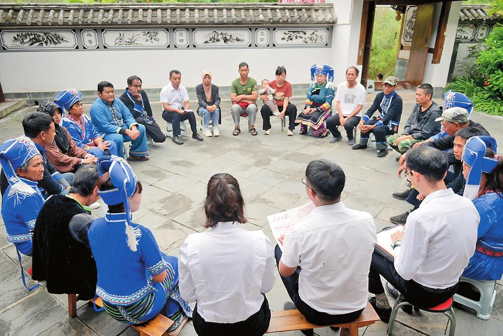 連日來,南澗彝族自治縣組織宣講小分隊(duì)進(jìn)機(jī)關(guān)、進(jìn)學(xué)校、進(jìn)村寨,結(jié)合實(shí)際開展宣講活動(dòng),幫助干部群眾學(xué)習(xí)領(lǐng)會黨的二十大精神。圖為宣講小分隊(duì)在該縣公郎鎮(zhèn)阿須樂村帶領(lǐng)群眾學(xué)習(xí)黨的二十大報(bào)告。(云南日報(bào) 通訊員 適志宏 張朝榮 魯學(xué)靖)