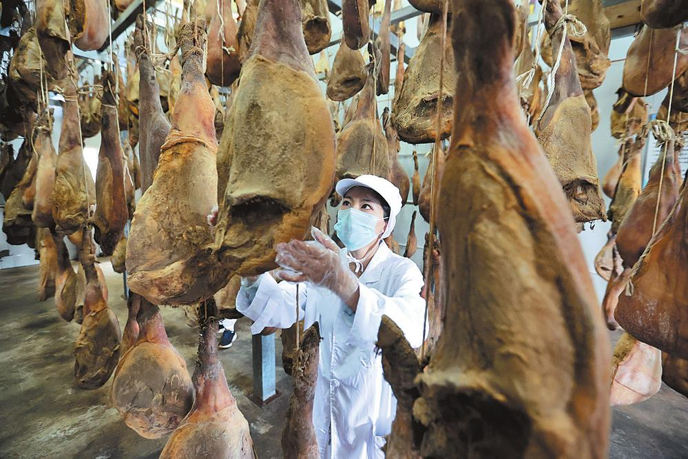來到火腿加工車間,大老遠就聞到一股濃濃的香味,工人們忙著加工、稱重、包裝產(chǎn)品。晾曬車間里,6000多只火腿整整齊齊吊曬,頗為壯觀。