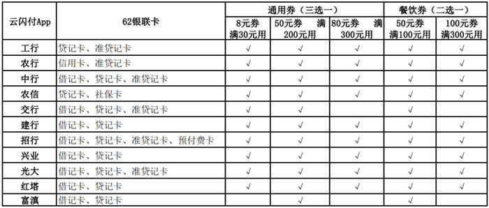 云閃付APP用戶(綁定參與銀行:工商銀行、農(nóng)行銀行、中國銀行、云南農(nóng)信、交通銀行、建設(shè)銀行、招商銀行、興業(yè)銀行、光大銀行、紅塔銀行、富滇銀行的指定62銀聯(lián)卡)