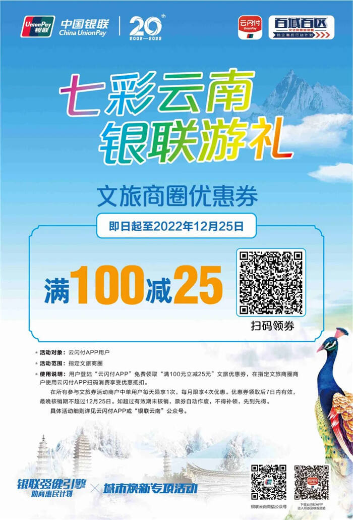 用戶登錄“云閃付APP”免費(fèi)領(lǐng)取“滿100元立減25元”文旅優(yōu)惠券,在指定文旅商圈商戶使用云閃付APP掃碼消費(fèi)享受優(yōu)惠抵扣。