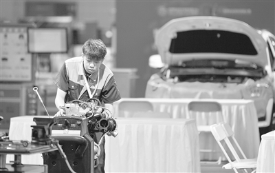 在天津舉行的首屆世界職業(yè)院校技能大賽上,參賽選手在進(jìn)行發(fā)動機(jī)拆卸維護(hù)展演。新華社記者 孫凡越 攝