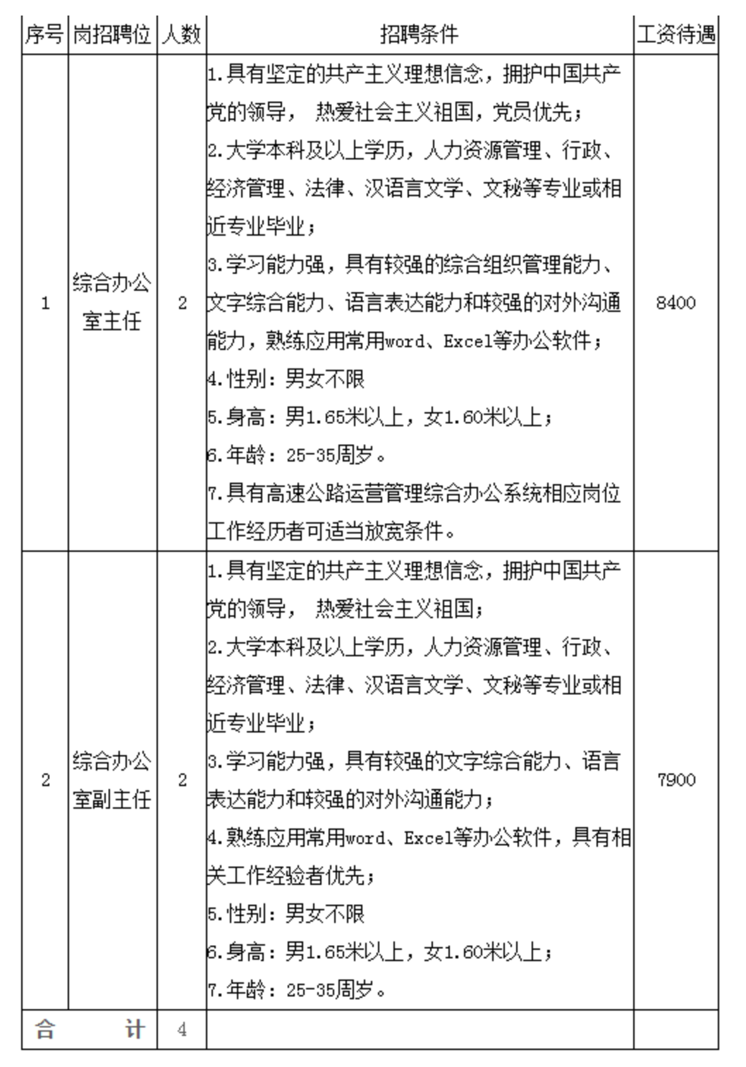 招聘崗位包含綜合辦公室主任2人,綜合辦公室副主任2人,年齡均須在25-35周歲。