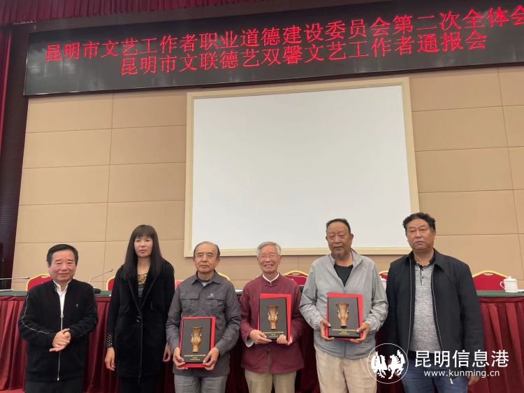會(huì)上,昆明市文聯(lián)黨組書記、主席陸毅敏,昆明市文聯(lián)秘書長(zhǎng)蘇紅文,昆明市文藝工作者職業(yè)道德建設(shè)委員會(huì)主任委員王仲德為昆明市文聯(lián)第一屆“德藝雙馨”文藝工作者吳然、劉建明、金永才頒發(fā)榮譽(yù)證書。