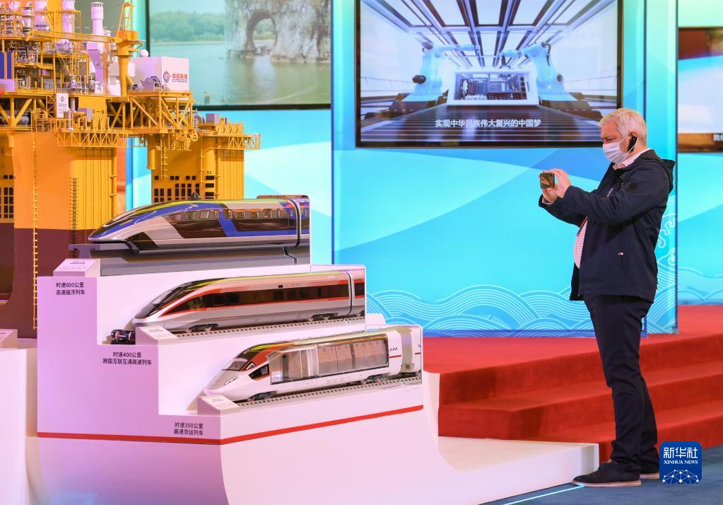 “天問一號”著陸器模型、“奮斗者”號全海深載人潛水器模型……室外展區(qū),一件件展現(xiàn)新時代中國人上九天、下五洋壯志豪情的展品,吸引外賓們拍照留影。