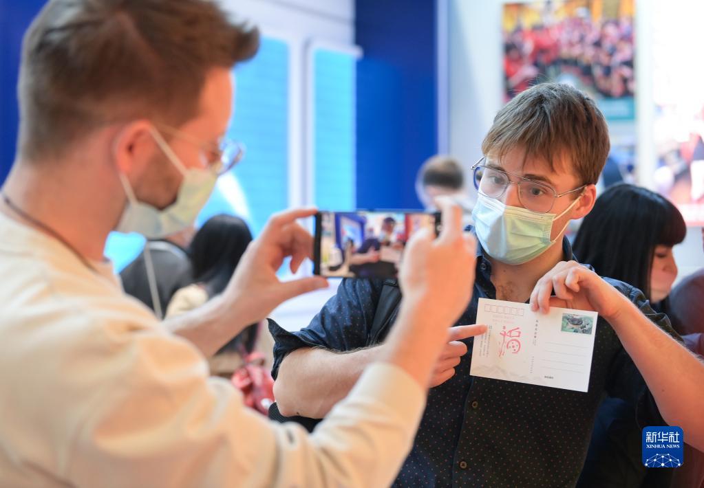 10月27日,外國嘉賓在互動體驗展臺前拍攝在明信片上蓋的印戳。新華社記者 李賀 攝
