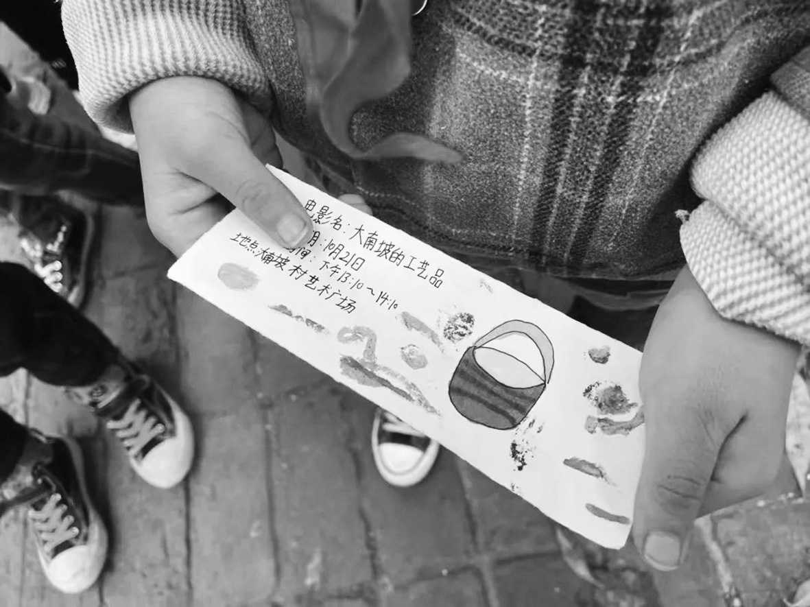 青年導演黃驥則通過開展5天的“兒童影像訓練營”,從團隊分工、選題策劃、現場拍攝、錄音剪輯、逐格動畫、手繪電影票、公眾宣發(fā)到電影節(jié)組織,指導孩子參與完成每一個環(huán)節(jié),鍛煉了孩子的創(chuàng)意制作、宣傳推廣、團隊協(xié)作能力。這些孩子一共完成了8部家鄉(xiāng)短片——《為什么來大南坡》《毛毛蟲游樂園》《牛爺爺的民宿》等,并在2021年“南坡秋興”活動中舉辦了“孩子們自己的電影節(jié)”首映式。受邀前來的觀眾和家長觀影后數度落淚,他們不僅被電影情節(jié)所觸動,更為這些小小電影人的創(chuàng)造力感到欣喜。