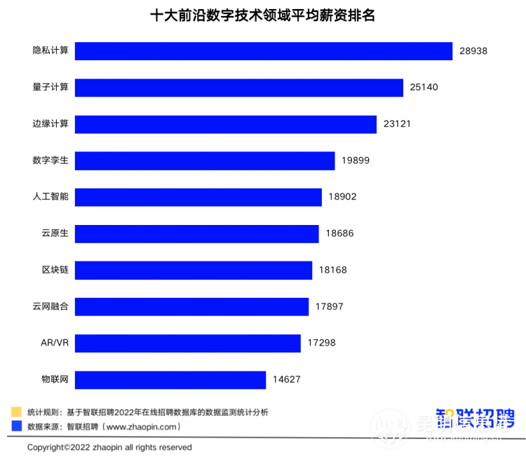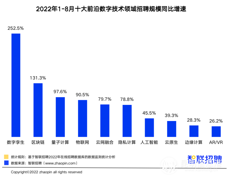 伴隨著數(shù)字技術(shù)的應(yīng)用落地,相應(yīng)人才招聘需求也隨之涌現(xiàn)。智聯(lián)招聘數(shù)據(jù)顯示,今年1至8月,十大前沿數(shù)字技術(shù)中,數(shù)字孿生領(lǐng)域技術(shù)崗位招聘規(guī)模同比增速最高,達252.5%。而區(qū)塊鏈以131.3%的招聘需求增速緊隨其后。在兩大技術(shù)招聘需求實現(xiàn)3位數(shù)的超速增長外,其余前沿技術(shù)的表現(xiàn)也十分亮眼,量子計算、物聯(lián)網(wǎng)、云網(wǎng)融合、隱私計算,分別以97.6%、90.5%、79.7%、78.8%的同比增速排名TOP 3-TOP 6。此外,發(fā)展相對成熟的人工智能招聘規(guī)模同比增長45.5%,云原生、邊緣計算兩項“超前”技術(shù)增速分別為39.3%、28.3%。在多領(lǐng)域得到充分應(yīng)用的AR/VR技術(shù)招聘需求,同比增速為26.2%,排在十強之末。