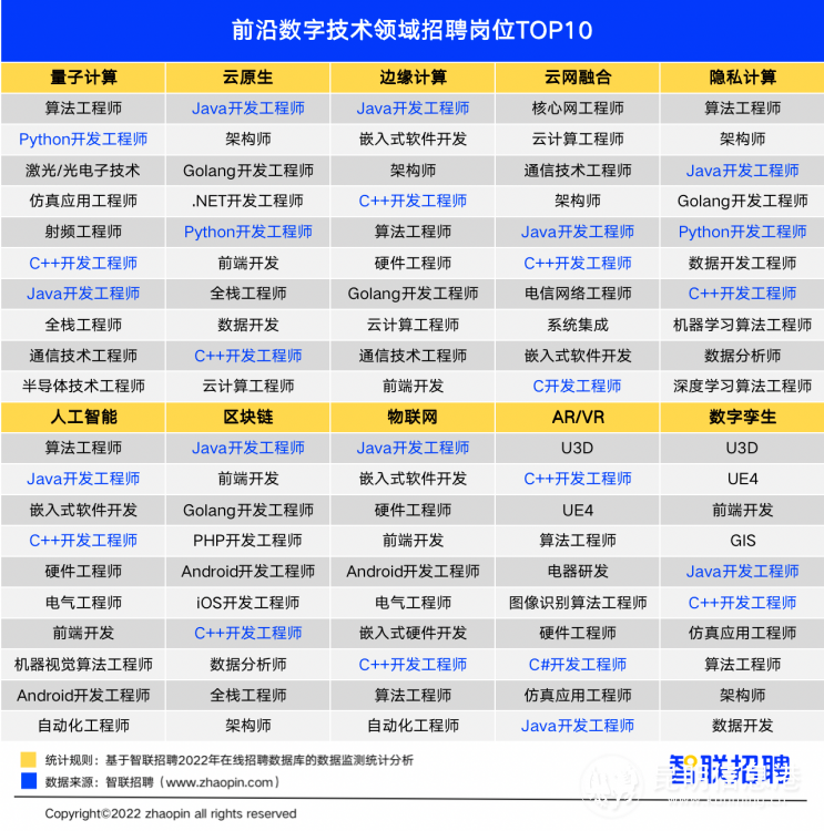 總體來說,隨著數(shù)字孿生、量子計算等“超前沿”技術(shù)從技術(shù)概念演變成新的轉(zhuǎn)型路徑和變革動力,人才需求增長也呈現(xiàn)出迅猛之勢。而人工智能、AR/VR等技術(shù)發(fā)展及應(yīng)用時間較久,市場競爭充分、格局相對固定,因此對人才的招聘需求增速相對較低。