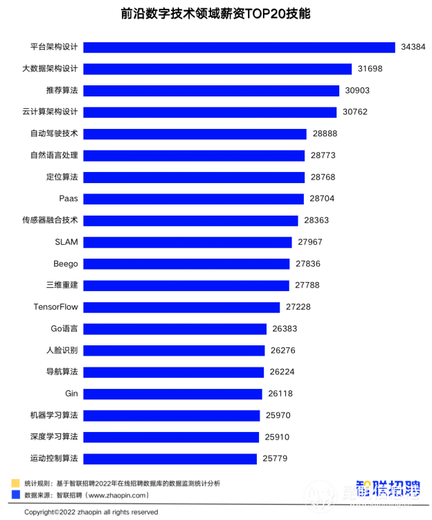 十大技術(shù)領(lǐng)域中,隱私計算技術(shù)崗以28938元/月的平均薪酬排名第一,其次是量子計算和邊緣計算,分別達到25140元/月、23121元/月。其他領(lǐng)域的技術(shù)崗,月薪也都在1.4萬元以上,排名最末的物聯(lián)網(wǎng)平均月薪仍為14627元/月。十大數(shù)字技術(shù)產(chǎn)業(yè)薪資待遇遠(yuǎn)超全國平均水平,并且呈現(xiàn)出技術(shù)性越強、薪酬水平越高的趨勢。從具體崗位來看,深度學(xué)習(xí)算法工程師以31243元/月的平均薪酬排名第一,超過3萬元月薪的崗位還有架構(gòu)師,收入31118元/月。由此可見,在數(shù)字技術(shù)領(lǐng)域,深度學(xué)習(xí)與架構(gòu)是通往高薪的“快車道”。