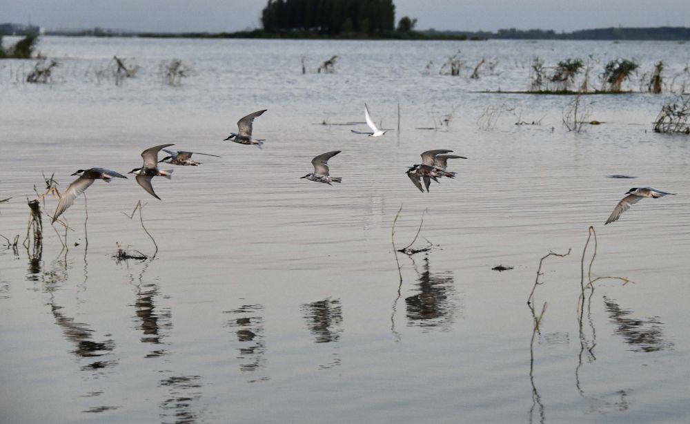 野生鳥(niǎo)類(lèi)在生態(tài)環(huán)境優(yōu)美的微山湖棲息(2022年8月23日攝)。新華社記者 徐速繪 攝