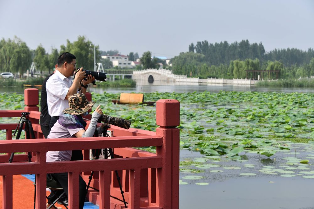 攝影愛(ài)好者在微山湖拍攝野生鳥(niǎo)類(lèi)(2022年7月21日攝)。新華社記者 徐速繪 攝