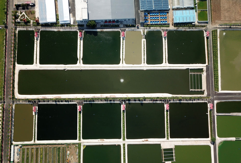 從空中俯瞰山東省微山縣現(xiàn)代漁業(yè)產(chǎn)業(yè)園生態(tài)魚(yú)塘(2022年8月23日攝,無(wú)人機(jī)照片)。新華社記者 徐速繪 攝