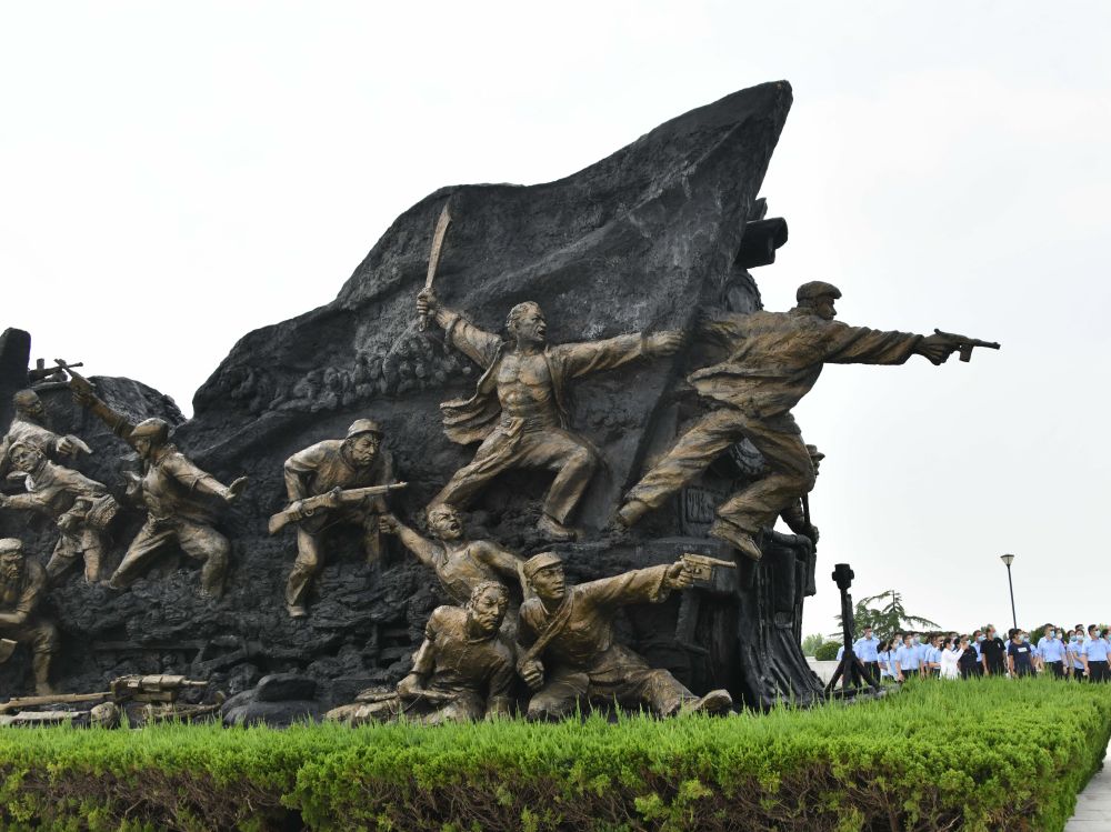 人們?cè)谏綎|省微山縣鐵道游擊隊(duì)紀(jì)念園內(nèi)參觀(2022年7月21日攝)。新華社記者 徐速繪 攝