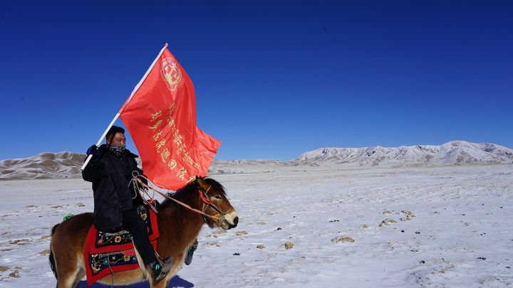 2021年12月20日,瑪多縣人民法院院長錢快乾騎著馬,擎著“瑪多法院巡回法庭”的旗子,下鄉(xiāng)進(jìn)行普法宣傳。新華社發(fā)