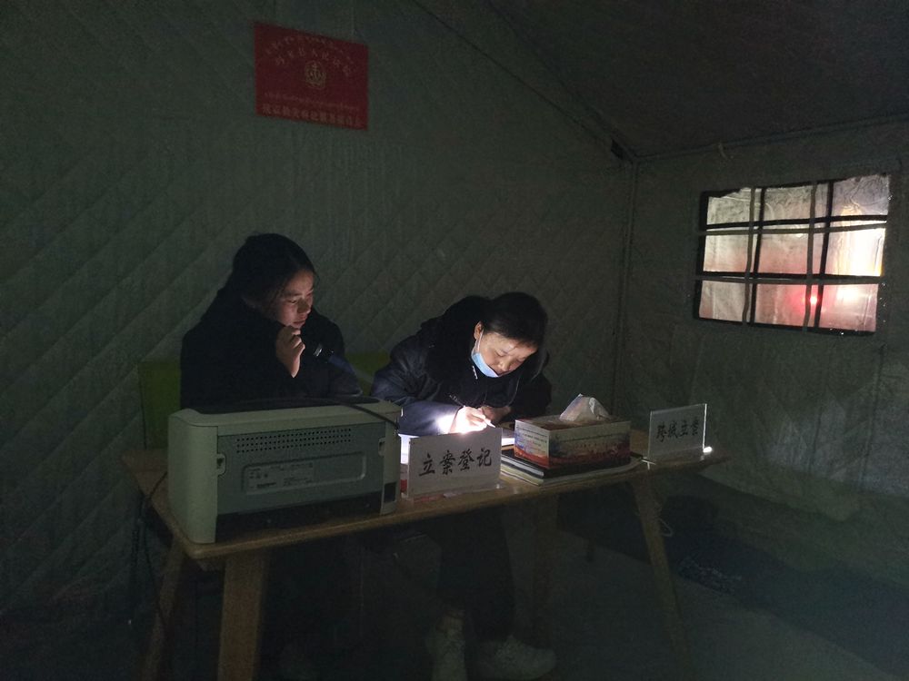 2021年5月26日,在抗震救災(zāi)臨時辦公點(diǎn)的帳篷內(nèi),瑪多縣人民法院法官助理更周措(右)在手電筒照射的燈光下進(jìn)行立案登記。新華社發(fā)