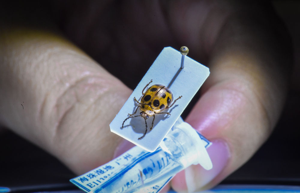 這是在廣州海珠濕地發(fā)現(xiàn)的一個昆蟲新物種——海珠斯螢葉甲的標(biāo)本(2021年10月25日攝)。