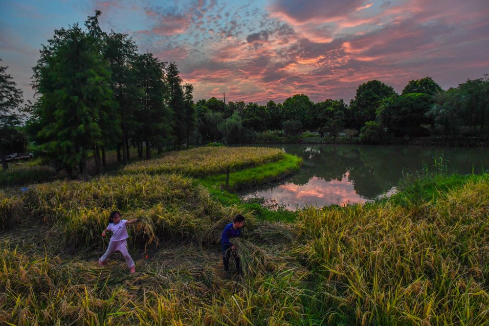 孩子在廣州海珠濕地水稻田體驗(yàn)收割勞作(2020年7月25日攝)。
