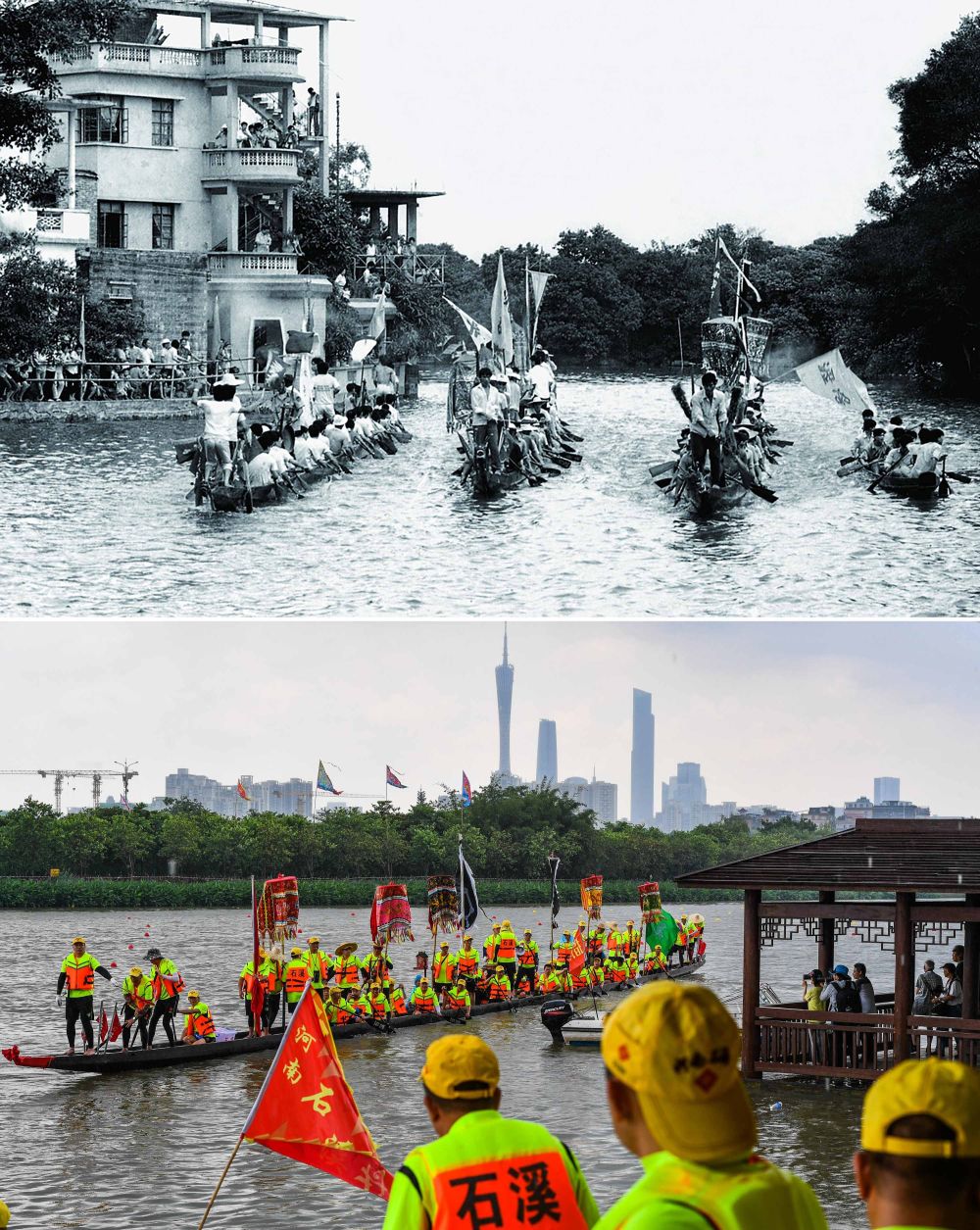 這是一張拼版照片:上圖是1982年,位于現(xiàn)在廣州海珠濕地范圍內(nèi)的龍?zhí)洞宕迕裨诙宋缜昂蠖俘堉郏ㄙY料照片);下圖是2019年6月6日拍攝的廣州海珠濕地端午劃龍舟場景(新華社記者劉大偉/攝)。