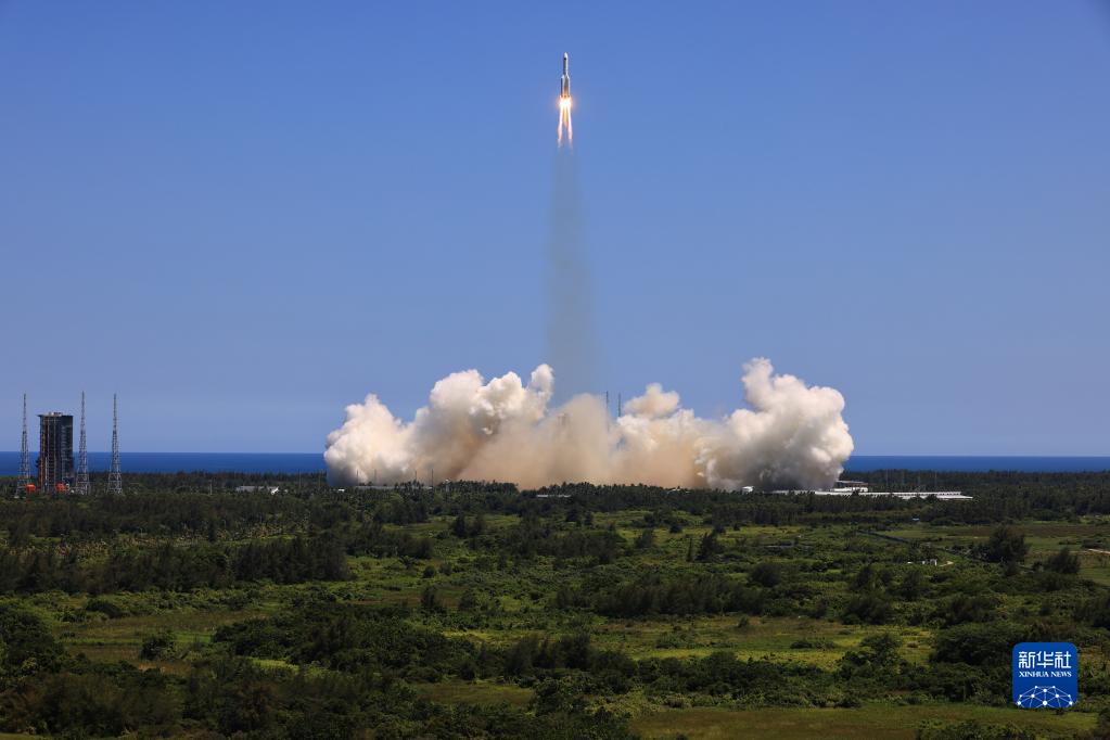 2021年4月29日11時(shí)23分,中國(guó)空間站天和核心艙在我國(guó)文昌航天發(fā)射場(chǎng)發(fā)射升空,準(zhǔn)確進(jìn)入預(yù)定軌道,任務(wù)取得成功。新華社記者 周佳誼 攝