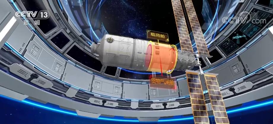 看到這里,您可能會(huì)有疑問,為什么工作艙艙門是和兩個(gè)艙相連呢?我們通過動(dòng)畫演示來進(jìn)一步了解。這里是夢(mèng)天實(shí)驗(yàn)艙的貨物氣閘艙以及載荷艙。這兩個(gè)部分最特別的地方,就在于它們采用了“雙艙嵌套”方式,也就是在載荷艙內(nèi)部,包含了貨物氣閘艙。