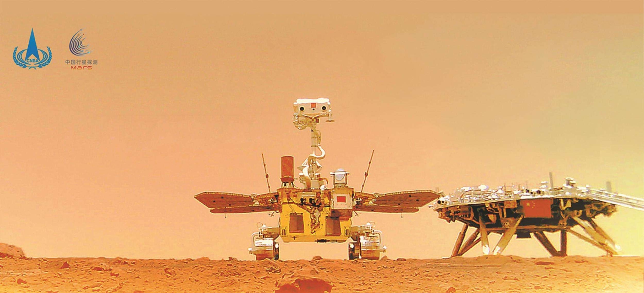 中國首次火星探測天問一號任務(wù)“祝融號”火星車與著陸器合影。國家航天局供圖