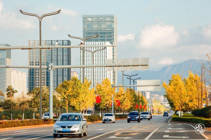 車輛行駛至漁浦路,這條以銀杏為主題的特色林蔭大道數(shù)百株銀杏枝繁葉茂,整齊地排列在寬闊的大道旁。來(lái)自滇池的風(fēng)將銀杏葉吹拂得沙沙作響,濃郁的秋意點(diǎn)綴了街景,讓途經(jīng)于此的人們視野豁然開(kāi)朗,頓覺(jué)心情大好。