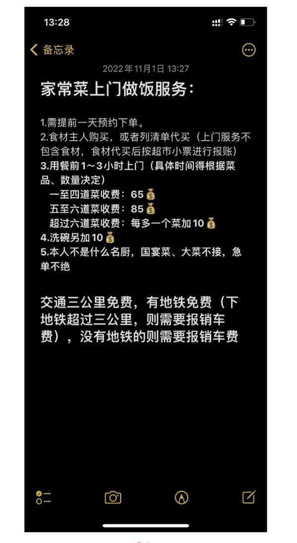 剛畢業(yè)的澄宜(化名)通過(guò)社交平臺(tái)發(fā)布了代廚服務(wù)的標(biāo)準(zhǔn)信息?!疤崆耙惶祛A(yù)約”“食材不提供代買”,“一至四菜收費(fèi)65元”“五至六菜收費(fèi)85元”,以及“無(wú)地鐵外報(bào)銷車費(fèi)”的詳細(xì)標(biāo)準(zhǔn)。信息一經(jīng)發(fā)出,不少人給出了詳細(xì)咨詢的回復(fù),“十分需要,請(qǐng)問(wèn)如何預(yù)約?!薄拔抑恍枰獌刹艘粶?,一天一頓?!卑凑粘我税l(fā)布的菜單,種類豐富且營(yíng)養(yǎng)均衡。湯類有鯽魚湯、蟲草雞,日常菜有小龍蝦、糖醋排骨,還有紅糖糍粑等小吃甜品一類。同時(shí),她也附加了可應(yīng)客戶需求,對(duì)菜品類型進(jìn)行擴(kuò)充的說(shuō)明。