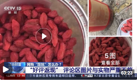 2021年4月,劉先生在某電子商務平臺上看到了一款商家售賣的枸杞,標價7元。他瀏覽商品評論區(qū)發(fā)現(xiàn),有許多消費者對這款商品予以好評,他當即下了單。然而收到貨之后,他發(fā)現(xiàn)實物與圖片中宣傳的枸杞有很大的差別。除了收到的枸杞與宣傳圖片有差距之外,劉先生還在收到的包裹里發(fā)現(xiàn)了一張卡片,商家會給發(fā)布好評的消費者返5元現(xiàn)金↓↓↓