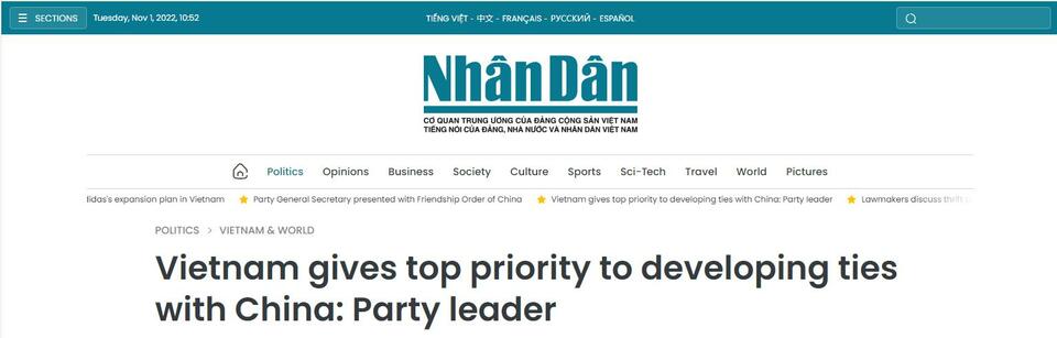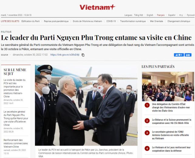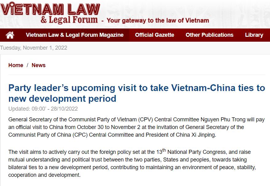 應中共中央總書記、國家主席習近平邀請,越共中央總書記阮富仲于10月30日至11月2日對中國進行正式訪問,成為中共二十大閉幕后首位訪華的外國領(lǐng)導人。此次訪問拉開二十大后中國主場外交熱潮序幕。海外媒體對此高度關(guān)注,紛紛發(fā)文指出習近平與阮富仲此次會談對中越兩國都具有重要意義,也為維護和平穩(wěn)定、合作發(fā)展的國際環(huán)境作出積極貢獻。
