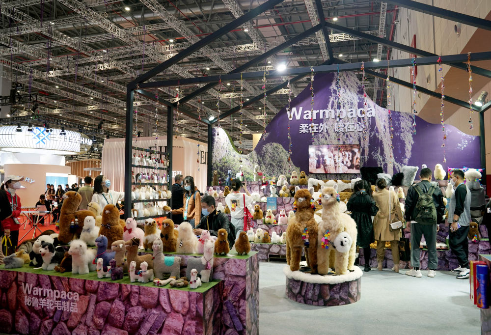 第四屆中國(guó)國(guó)際進(jìn)口博覽會(huì)消費(fèi)品展區(qū)的秘魯羊駝毛玩偶展臺(tái)(2021年11月6日攝)。新華社記者 劉穎 攝