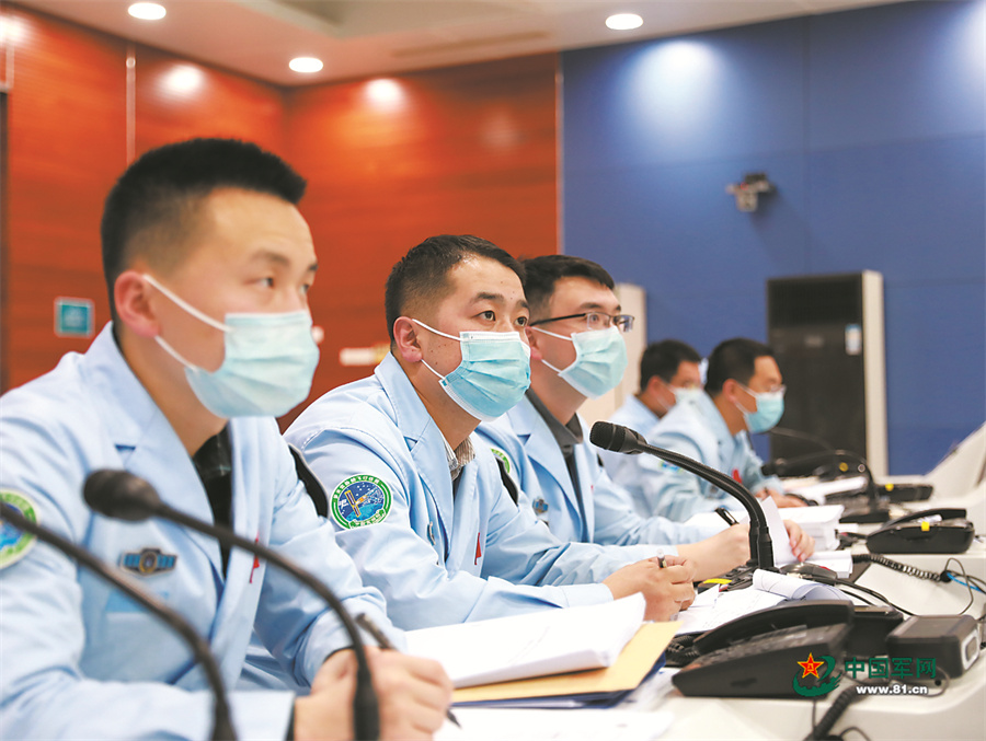 北京空間信息傳輸中心,高泉(左二)正在報告任務狀態(tài)。李源龍攝