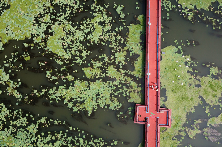 濟寧市微山湖旅游區(qū)荷園景色。微山湖旅游區(qū)內有微山湖國家濕地公園等。新華社記者徐速繪/攝