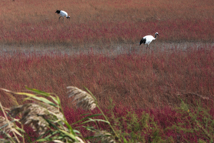 在位于盤錦的遼河三角洲濕地包括蘆葦沼澤、淺海海域、河流庫塘、水稻田等濕地類型。特殊環(huán)境孕育出的堿蓬草鋪滿灘涂,一到秋天這里就成了“紅色海岸線”。新華社記者王乙杰/攝