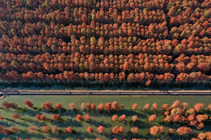 武漢漲渡湖濕地公園“水上森林”色彩斑斕。新華社發(fā)(趙軍/攝)