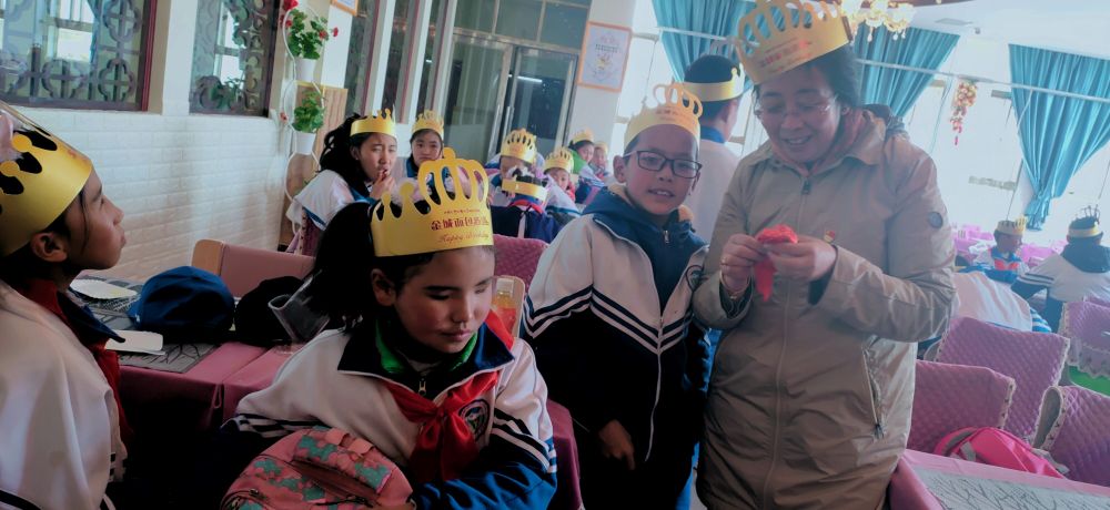 在那曲市特殊教育學(xué)校里,次仁拉姆和學(xué)生們一起過生日,看學(xué)生們制作生日禮物(受訪者供圖)。