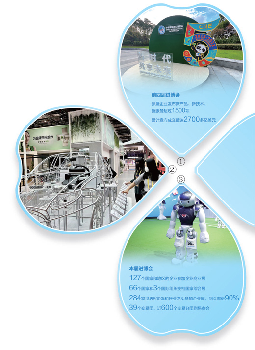 圖①:在國家會展中心(上海),“新時代,共享未來”主題景觀格外醒目。本報記者 強 薇攝