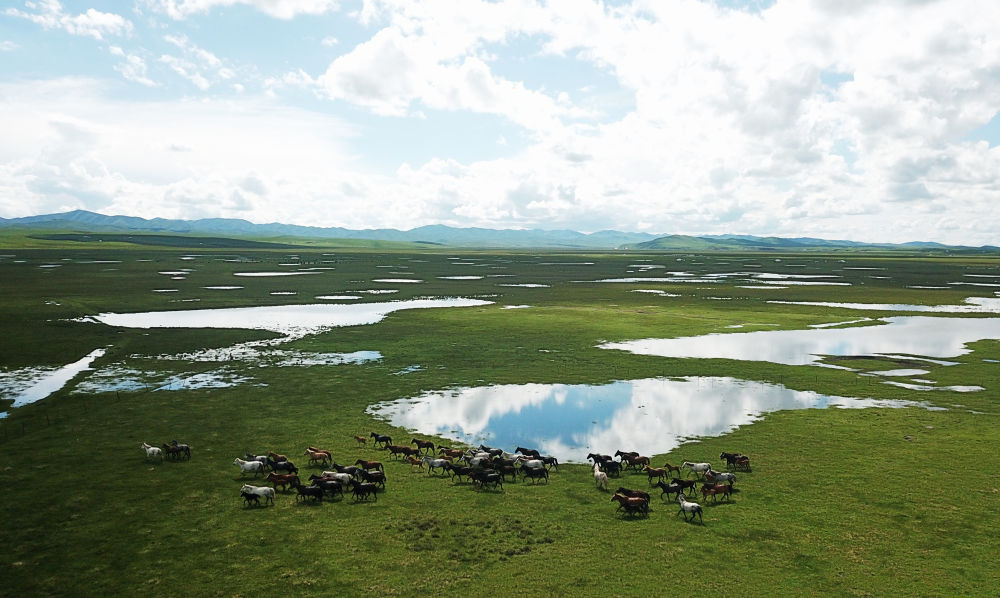 河曲馬在甘肅省甘南藏族自治州瑪曲縣河曲馬場的濕地奔跑(無人機照片)。新華社記者 陳斌 攝