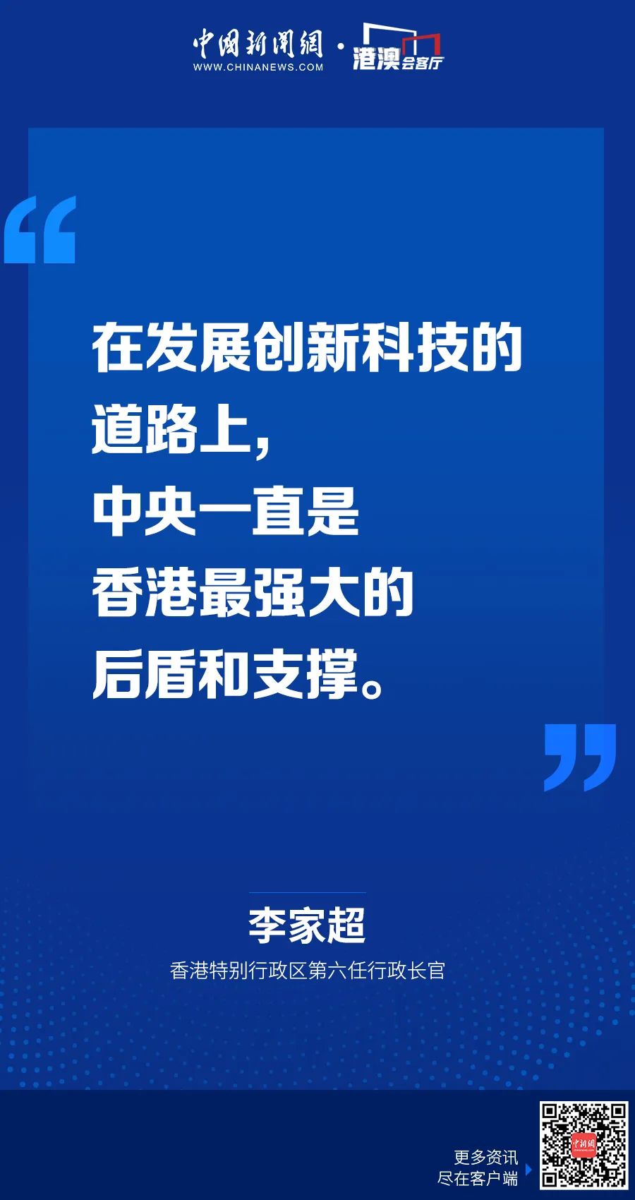 香港社會亦會全力以赴建設(shè)國際創(chuàng)新科技中心。我過去多次表示:“無創(chuàng)科、無未來”,特區(qū)政府會全力、全速推動香港創(chuàng)科發(fā)展,推進香港和粵港澳大灣區(qū)其他城市產(chǎn)業(yè)鏈優(yōu)勢互補,建設(shè)更蓬勃的創(chuàng)科生態(tài)圈,加快智慧城市發(fā)展,推進香港在創(chuàng)新科技發(fā)展實現(xiàn)新飛躍。