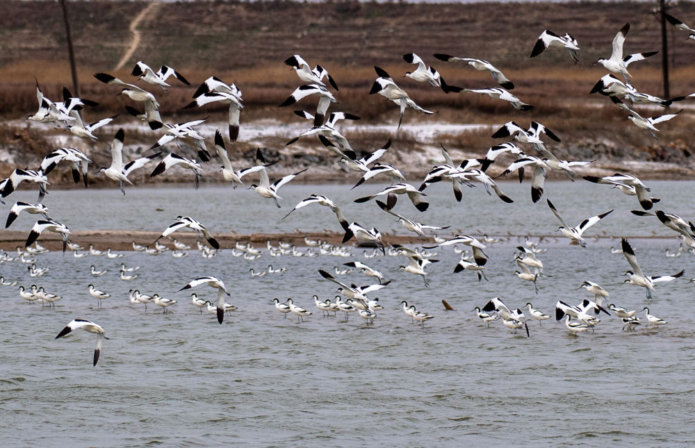 一群候鳥在山西運城鹽湖濕地嬉戲。(受訪者供圖)