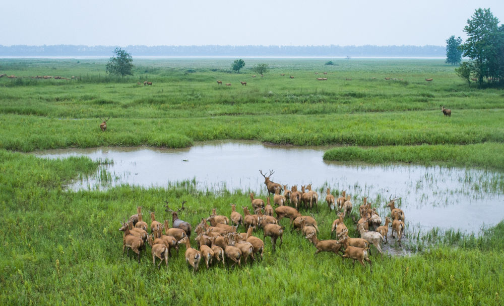 一群麋鹿在湖北石首麋鹿國(guó)家級(jí)自然保護(hù)區(qū)內(nèi)活動(dòng)(2021年5月17日攝,無(wú)人機(jī)照片)。新華社記者 肖藝九 攝