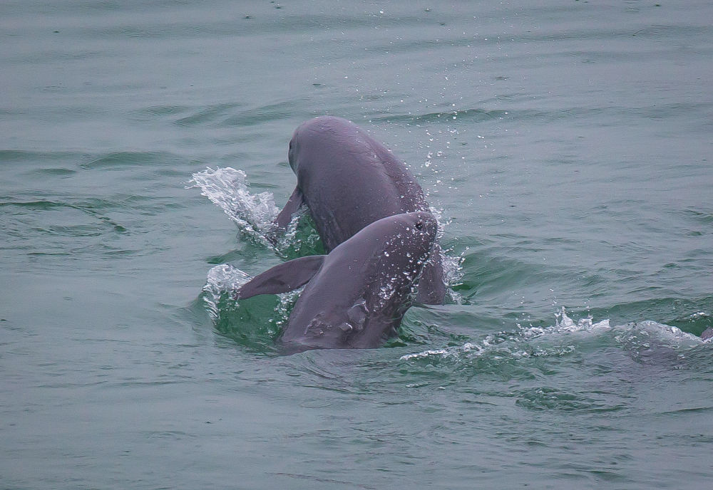在湖北省宜昌市江邊,長(zhǎng)江江豚在水中嬉戲(2021年5月10日攝)。新華社記者 肖藝九 攝