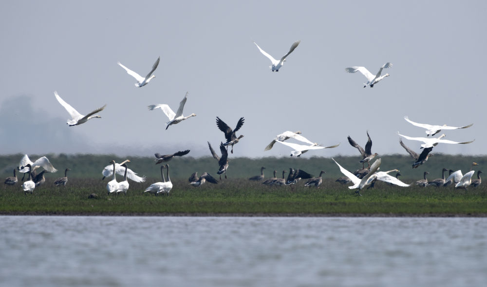 一群小天鵝和豆雁在洞庭湖的一處濕地生境修復(fù)工程實(shí)驗(yàn)區(qū)內(nèi)飛翔(2018年2月26日攝)。新華社記者 李尕 攝