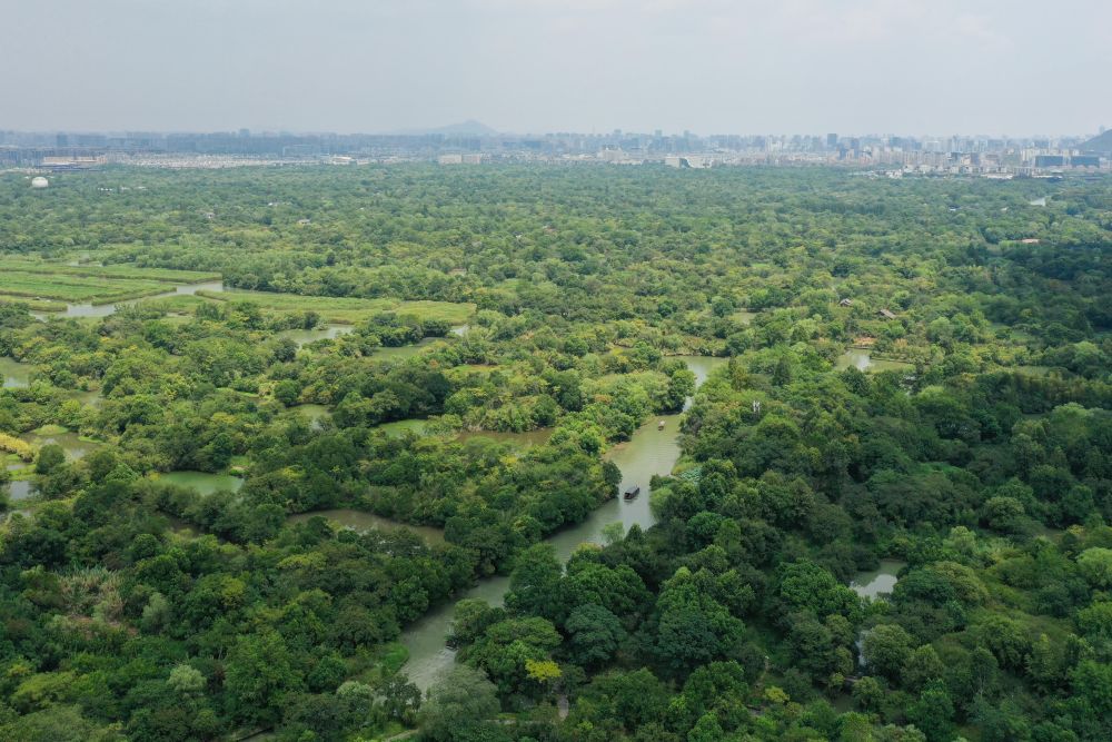 2020年8月22日拍攝的西溪國(guó)家濕地公園(無(wú)人機(jī)照片)。新華社記者 黃宗治 攝