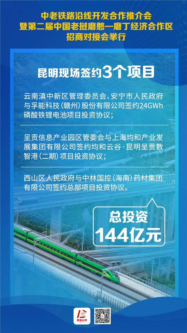 11月5日,在中老鐵路沿線開(kāi)發(fā)合作推介會(huì)暨第二屆中國(guó)老撾磨憨—磨丁經(jīng)濟(jì)合作區(qū)招商對(duì)接會(huì)上,昆明市現(xiàn)場(chǎng)簽約3個(gè)項(xiàng)目,合計(jì)投資金額144億元。