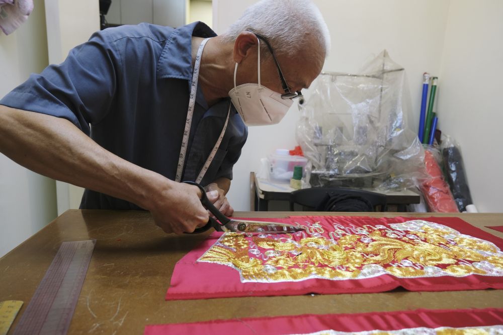 在位于香港九龍的冠南華店中,一位老師傅在制作中式裙褂(9月27日攝)。新華社記者 王申 攝