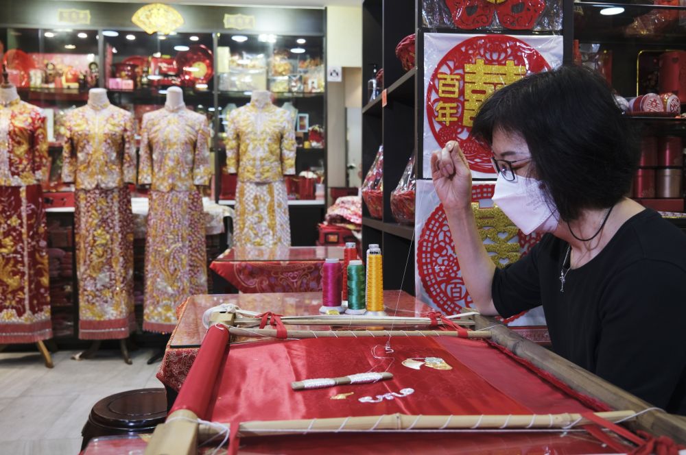 林卓怡說,為確保每一件裙褂的圖案對稱流暢,光澤持久,“刺繡必須由同一位師傅完成,且手上不能有汗,否則會讓金銀線氧化變色”。他們聘請的刺繡師傅都是從業(yè)幾十年的老師傅,目前主要集中在江蘇蘇州。