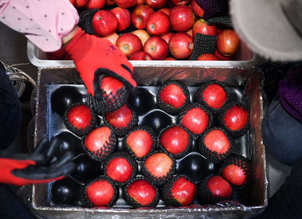 9月20日,陜西延安市洛川縣一家果業(yè)公司的工作人員在包裝線上忙碌。新華社記者邵瑞/攝