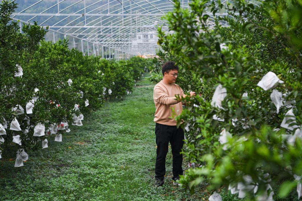 初冬時節(jié),重慶大足區(qū)中敖鎮(zhèn)加福村的上千畝柑橘林掛滿果實。“園長”劉峰鉆正忙著查看晚熟柑橘的生長情況。碩士畢業(yè)后,劉峰鉆曾作為一名工程師參與水電站建設(shè)。出于對農(nóng)業(yè)的興趣,2017年他辭掉工作,和合伙人到這里流轉(zhuǎn)1010畝土地,建起柑橘園。